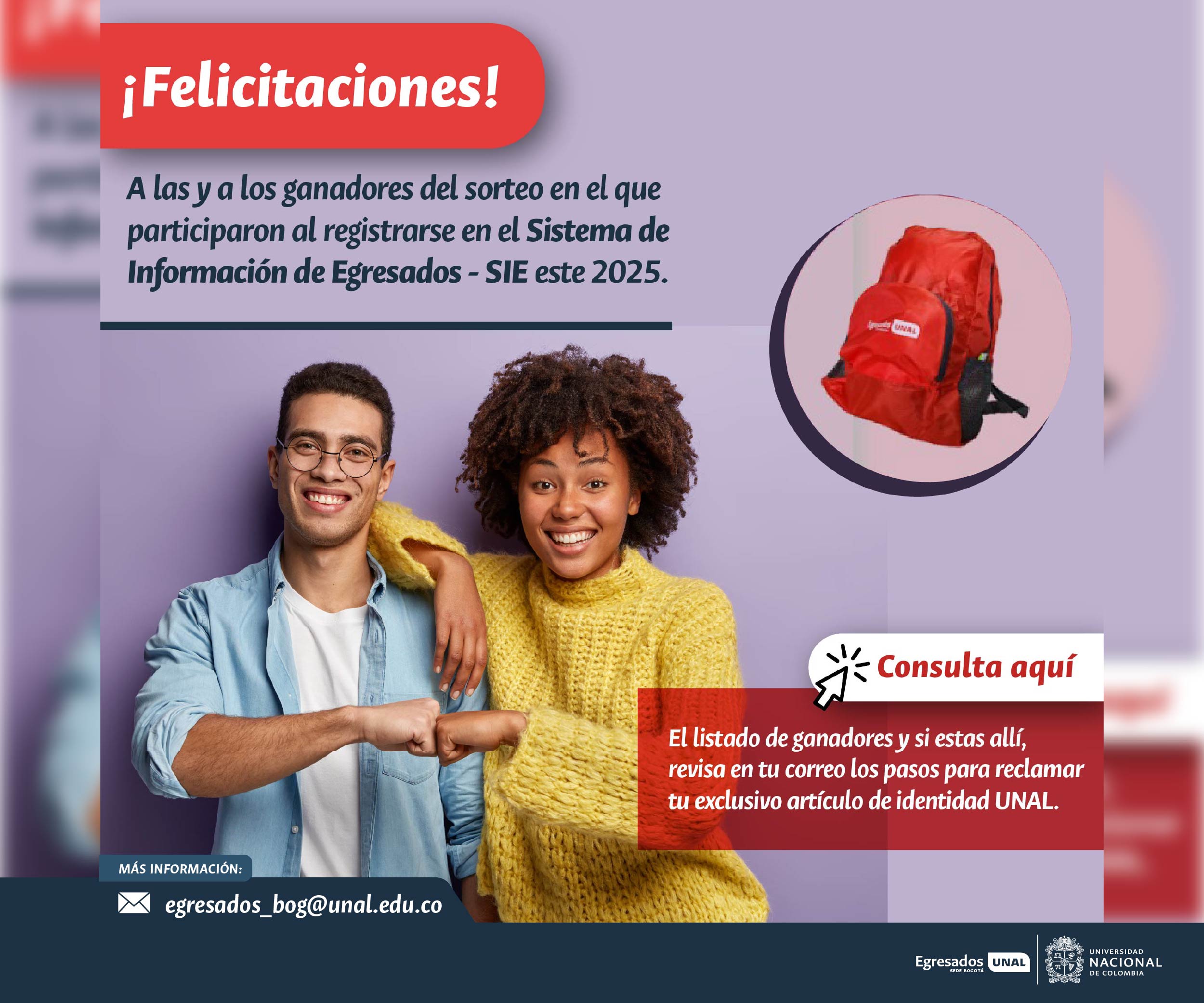 El Programa de Egresados de la Universidad Nacional de Colombia Sede Bogotá informa que ya se encuentran disponibles los resultados del sorteo realizado entre quienes se registraron en el Sistema de Información de Egresados – SIE.