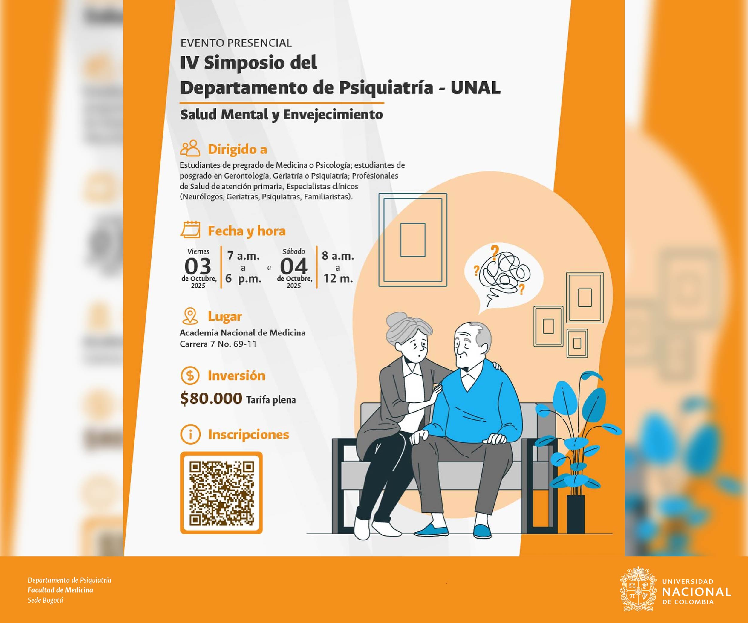 El IV Simposio del Departamento de Psiquiatría – UNAL: Salud Mental y Envejecimiento se realizará los días 3 y 4 de octubre de 2025.
