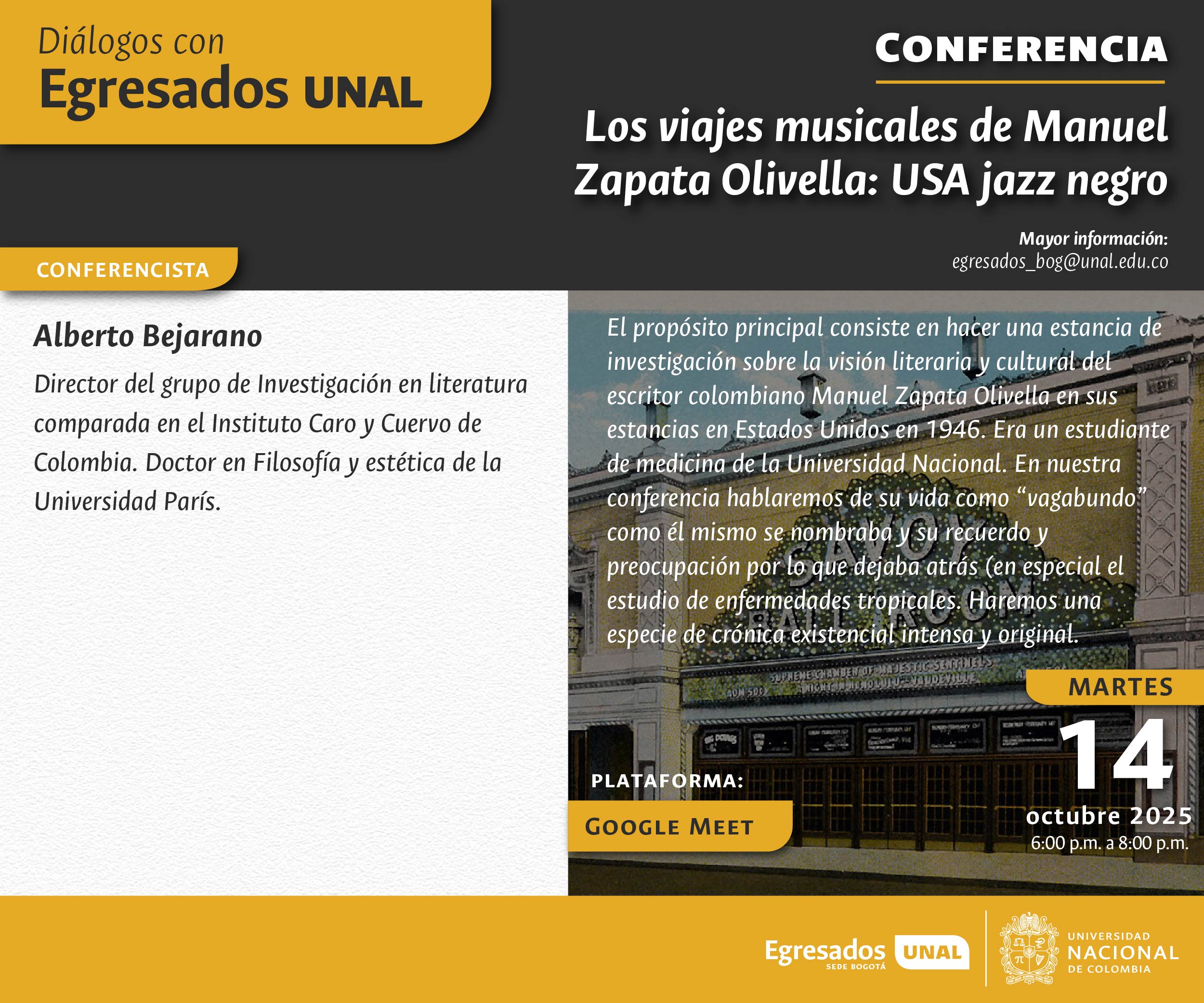 Te invitamos a la conferencia “Los viajes musicales de Manuel Zapata Olivella: USA jazz negro”, un recorrido por la visión literaria y cultural del escritor colombiano durante su estancia en Estados Unidos en 1946.