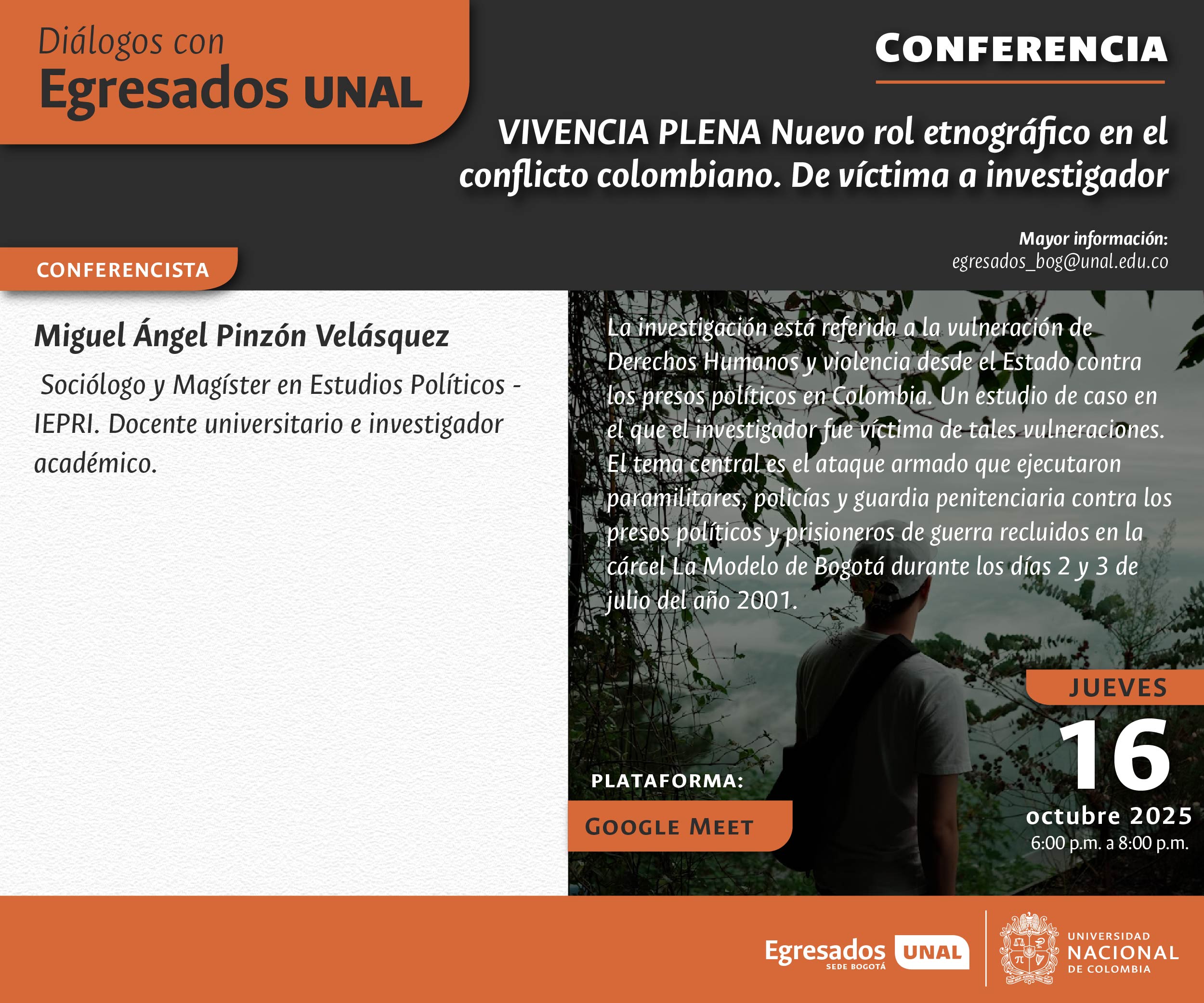 Acompáñanos en Diálogos con Egresados 2025-2: VIVENCIA PLENA Nuevo rol etnográfico en el conflicto colombiano. De víctima a investigador