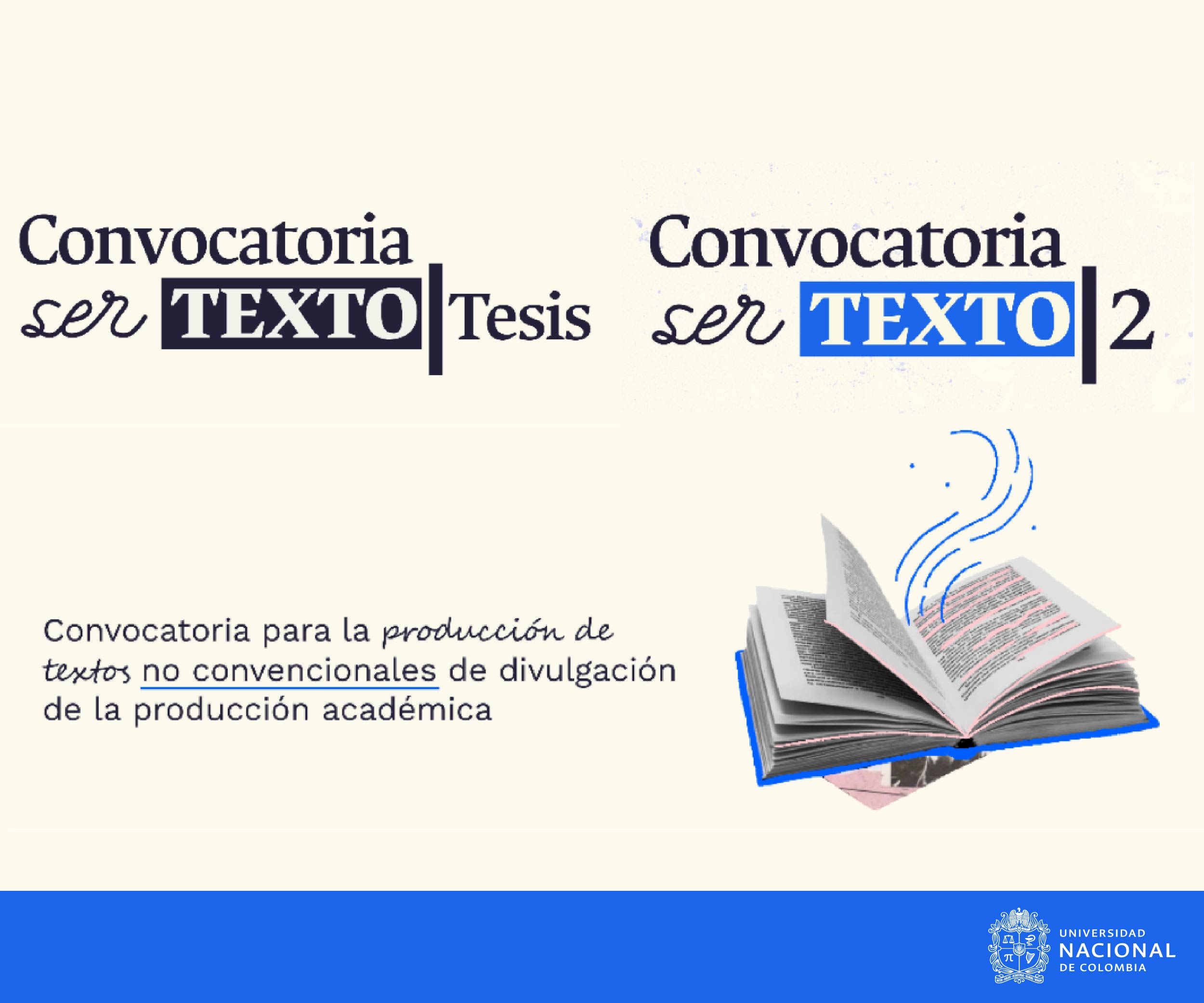 La Editorial Universidad Nacional de Colombia, en articulación con la Vicerrectoría de Investigación, los/las invita a participar en las convocatorias SER TEXTO TESIS y SER TEXTO II, dirigidas respectivamente a egresados de programas de especialidades médicas y doctorado, y a docentes con proyectos de investigación o extensión finalizados.